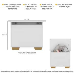 O Baú Organizador Caixa de Brinquedos Pés Quadrados Multimóveis é produzido em MDP com acabamento acetinado (cerca de 20% de brilho), que garante maior durabilidade, resistência e facilidade na limpeza. Com amplo espaço interno para organizar brinquedos ou outros pertences, ele suporta até 15kg e, para maior segurança, o articulador da tampa possui trava, para evitar acidentes. Os pés quadrados, em polipropileno, facilitam na hora da limpeza. O design clean, com linhas retas, torna o móvel muito versátil, permitindo que seja utilizado em qualquer cômodo da casa e até mesmo de escritório.