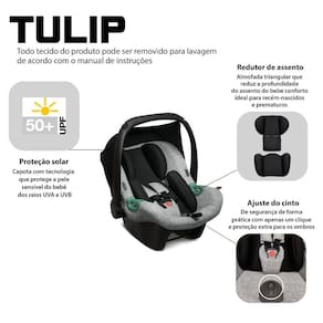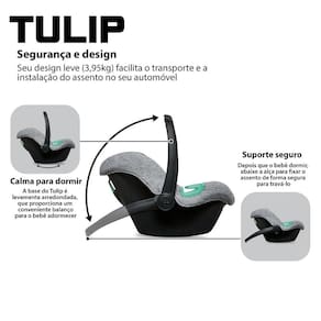 A Base do Bebê Conforto TULIP é levemente arredondada que proporciona um conveniente balanço para o bebê adormecer e pode ser travado quando abaixada a alça de transporte.