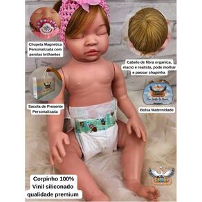 Essa linda bebê tem como grande diferencial o cabelo, o cabelo é confeccionado em nossa própria fábrica por nossas costureiras, é único no mercado, feito sob medida, com material de fibra orgânica, muito semelhante ao cabelo humano, é resistente a agua e chapinha