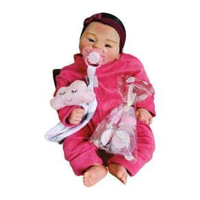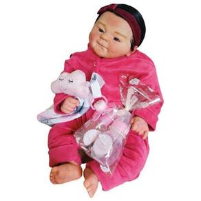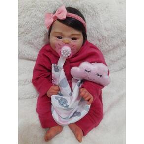 Bebê reborn menina feita a partir do molde Coco Malu, com cabeça e membros em vinil siliconado e corpinho feito de tecido. Pintura toda a mão com marquinhas de expressão, cabelo implantado totalmente fio a fio e acompanha o enxoval da bebê e kit de documentos reborn para a criatividade.