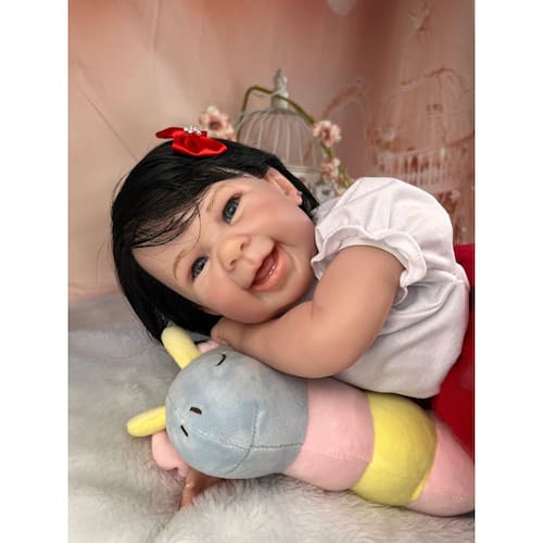 Nossos bebês são confeccionados com o mais alto padrão de qualidade em vinil siliconado e tecido macio. Os olhos azuis brilhantes garantem uma aparência encantadora e realista.