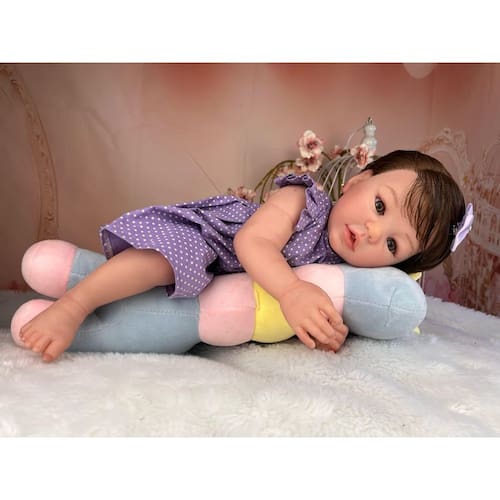 Nossos bebês são confeccionados com o mais alto padrão de qualidade em vinil siliconado. Os olhos castanhos brilhantes garantem uma aparência encantadora e realista.
