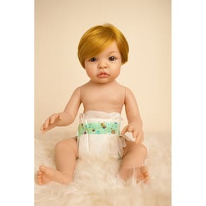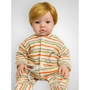 Esse linda bebê tem como grande diferencial o cabelo, o cabelo é confeccionado em nossa própria fábrica por nossas costureiras, é único no mercado, feito sob medida, com material de fibra orgânica, muito semelhante ao cabelo humano, é resistente a agua e chapinha