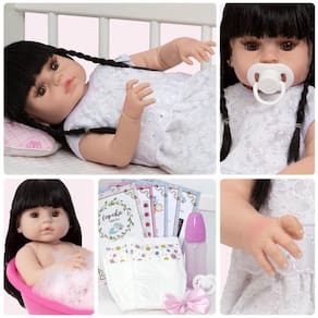 A Boneca Bebê Reborn é o sonho das crianças Produzida 100% em vinil siliconado, essa boneca pode sentar, deitar e fazer tudo que a sua imaginação deixar. Com seus olhos castanhos e detalhes realistas ela é encantadora e apaixonante. Sua criança merece a melhor qualidade de bebê reborn