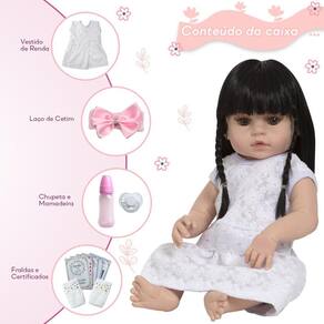 A Boneca Bebê Reborn é o sonho das crianças Produzida 100% em vinil siliconado, essa boneca pode sentar, deitar e fazer tudo que a sua imaginação deixar. Com seus olhos castanhos e detalhes realistas ela é encantadora e apaixonante. Sua criança merece a melhor qualidade de bebê reborn
