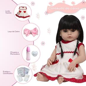 A Boneca Bebê Reborn é o sonho das crianças Produzida 100% em vinil siliconado, essa boneca pode sentar, deitar e fazer tudo que a sua imaginação deixar. Com seus olhos castanhos e detalhes realistas ela é encantadora e apaixonante. Sua criança merece a melhor qualidade de bebê reborn