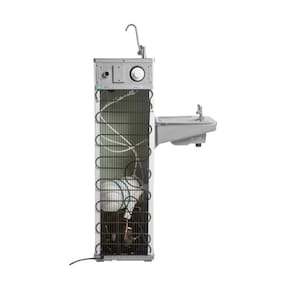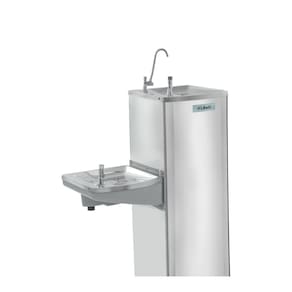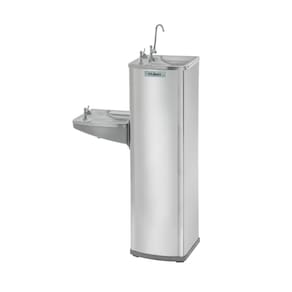 Bebedouro de coluna com sistema de tripla filtragem, atóxico e livre de contaminação, refrigera até 6 litros de água por hora, possui controlador de temperatura entre 4 e 15ºC, com sete níveis de temperatura, sistema interno de filtragem com três etapas de filtragem, gabinete em aço inox, base plástica de alto impacto, pia em aço inox polido, torneiras para copo e jato cromadas, conexões hidráulicas internas em material atóxico, reservatório para água gelada em poliacetal (atóxico), serpentina em aço inox localizada na parte interna do reservatório, refrigerado por compressor.Água gelada