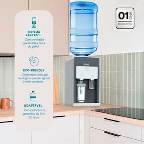 O uso diario foi simplificado ao maximo. O bebedouro conta com um pratico perfurador de galao integrado, que facilita a troca e evita derramamentos. Sua versatilidade permite o uso de garrafoes de 10 ou 20 litros, adaptando-se a sua necessidade de consumo. Para completar, um discreto painel com luz de LED indica o funcionamento do aparelho, mantendo voce sempre informado de forma clara e objetiva sobre o status da refrigeracao.
