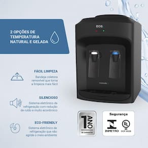 NãoO Bebedouro EOS Mineralle EBE01 de mesa é leve e compacto. Possui design moderno e sistema eletrônico de refrigeração com baixíssimo consumo de energia, silencioso e sem vibração. Ele conta com Sistema Abre Fácil através de um perfurador que faz da troca do galão uma tarefa muito fácil e prática. Oferece temperatura para todos os gostos: você pode escolher entre água gelada ou natural.