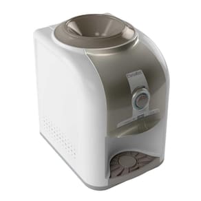 Bebedouro Gelágua de mesa Esmaltec EGM30 com refrigeração por compressor, termostato frontal para controle gradual de temperatura (5°C a 15°C), sistema Easy Open para garrafão e função Mix para água gelada e natural.Água gelada