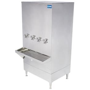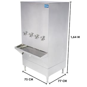 Resfriador com revestimento em aço inox, ajuste manual de temperatura e com bóia para controlar o nivel de água. Acompanha 4 torneiras para melhor distribuição de água, baixo consumo de energia.