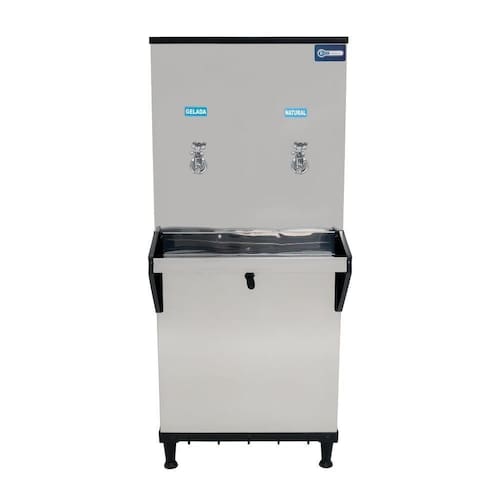 O modelo possui duas torneiras, sendo uma para água gelada e uma para natural, além de filtro POU 5 classe C, que reduz impurezas e melhora o sabor da água. O aparador de água reforçado com laterais em ABS aumenta a segurança no uso e facilita a limpeza, enquanto os pés reguláveis garantem estabilidade em diferentes superfícies.