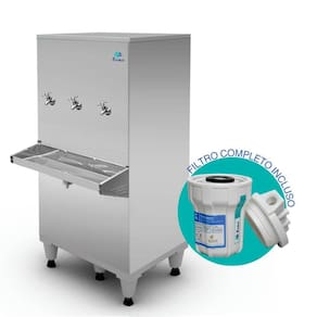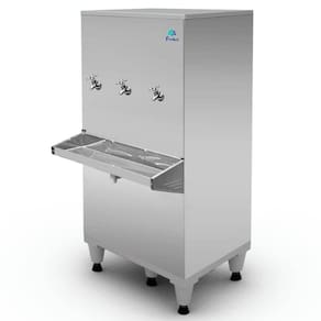 Bebedouro industrial de coluna com capacidade de 100 litros, duas torneiras para água gelada e uma para água natural. Design em inox para maior durabilidade e facilidade de limpeza.Água gelada