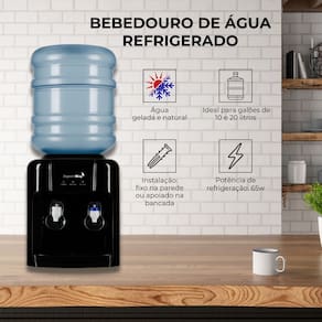 Refrigeração eletrônica, 2 torneiras (natural e gelada), base pingadeira removível, indicador LED de funcionamento e água fria, para galões de 10 a 20 litros.Água gelada