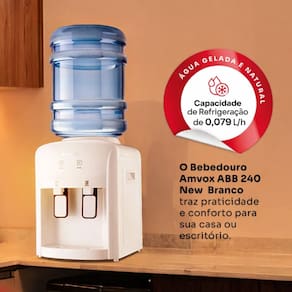 O Bebedouro ABB 240 NEW une design moderno e eficiência para levar mais praticidade e água gelada ao seu dia a dia. Ideal para casas e escritórios que buscam estilo, funcionalidade e conforto. Refrigeração eletrônica com capacidade de 0.079 l/h. Possui duas torneiras, bandeja coletora removível e indicador LED. Inclui furador de tampa do galão.Água gelada