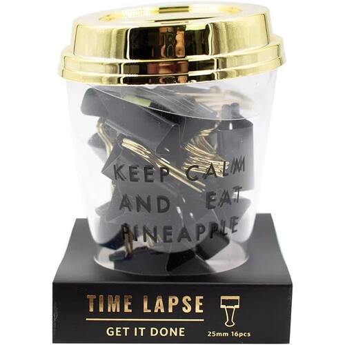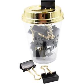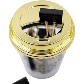 • Cor: preto/dourado. • Tamanho dos binders: 25mm. • Quantidade: 16 unidades. • Tampa com ímã. • Material do copinho: acrílico.