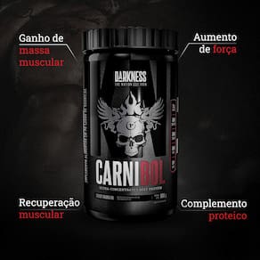Ganhos insanos de força e massa muscular com o suplemento Carnibol da Darkness. Sua fórmula traz um blend exclusivo de proteína isolada de carne bovina da melhor qualidade e peptídeos de colágeno (ProMyoBlend), com um excelente aporte nutricional aos monstros de verdade que buscam crescimento. A carne bovina, além do alto valor biológico, concentra naturalmente elevados índices de creatina, assim, as proteínas dessa origem são bastante favoráveis para quem busca ganhos em força e massa muscular, pensando nisso a Darkness criou o Carnibol, com baixo teor de sódio e gorduras, livre de lactose, seu perfil nutricional favorece o balanço nitrogenado positivo (ingestão de aminoácidos maior que sua degradação natural no organismo), uma ótima alternativa para os que não desejam consumir proteínas de origem láctea.