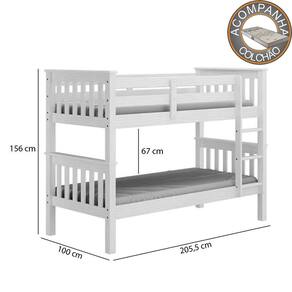 Características Estrutura em madeira ecologicamente correta (Eucalipto). Pintura com acabamento PU. Grade de segurança para a cama superior. Escada fixa. Suporta até 95 Kg cada, sem impacto. Acompanha colchão de 188x88cm.
