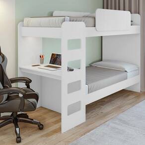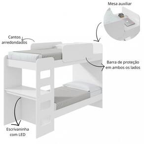 Essa beliche é ideal para quartos que precisam de espaço, com design moderno e soluções funcionais para o dia a dia. Possui barras de protação, luzes de LED e cantos arredondados para sua segurança. Com 5 travessões, distribuindo o peso e aumentando a resistência da cama. Dispositivo antirruído para um ambiente tranquilo, evitando rangidos e barulhos.