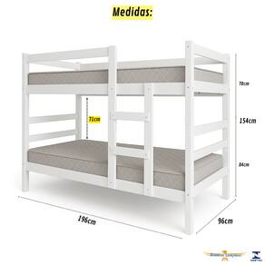 CARACTERÍSTICAS -Suporta 100 Kg em cada cama. -Altura total: 156cm. -Largura total: 94cm. -Pés com com protetor de umidade. -Estrado em madeira, com 5 ripas e 5 travessas cada um. -Acompanha manual com instruções simples e intuitivo.