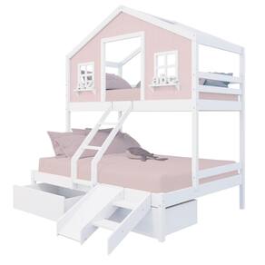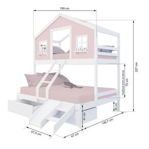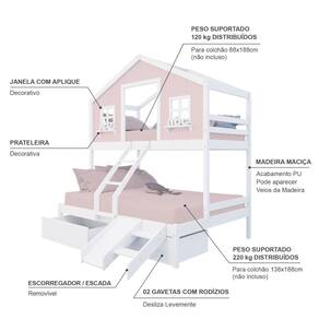 Diferenciais: Escada com Leve Curvatura, Casinha com fechamento em MDF, Janela e Prateleira Decorativa, 02 Gavetas com Rodízios, Kit Escada/ Escorregador.