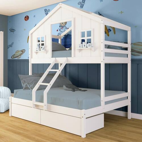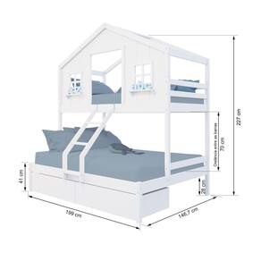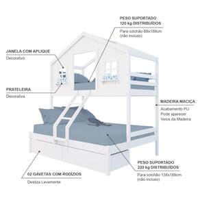 Diferenciais: Escada com Leve Curvatura, Casinha com fechamento em MDF, Janela e Prateleira Decorativa, 02 Gavetas com Rodízios.