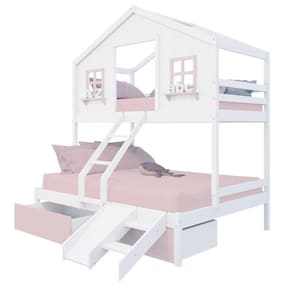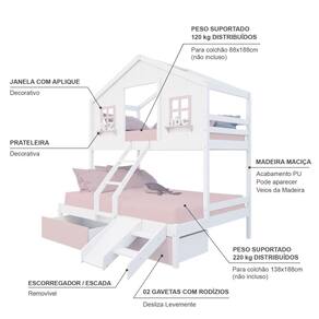 Diferenciais: Escada com Leve Curvatura, Casinha com fechamento em MDF, Janela e Prateleira Decorativa, 02 Gavetas com Rodízios, Kit Escada/ Escorregador.