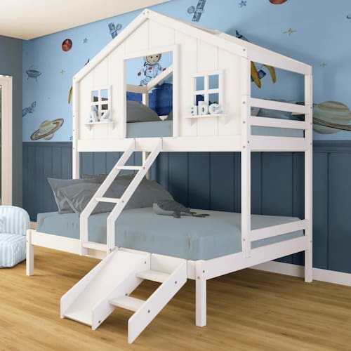 Diferenciais: Escada com Leve Curvatura, Casinha com fechamento em MDF, Janela e Prateleira Decorativa, kit Escada/ Escorregador.