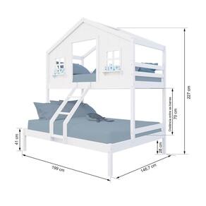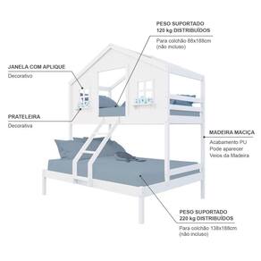 Material Principal: Madeira Maciça | Cor Predominante: Branco | Necessita Montagem: Sim | Acompanha Colchão: Não | Tipo de Cama: Beliche | Altura: 227 | Largura: 146,7 | Comprimento: 199 | Peso: 68 | Peso máximo suportado: 120 e 220 | Cor Via: Branco | Peso com Embalagem: 68 | Comprimento com Embalagem: 192 | Largura com Embalagem: 30 | Altura com Embalagem: 30 | Tamanho da Cama: Beliche Casal/ Solteiro | Descrição do Tamanho: Beliche Casal/ Solteiro | Quantidade de Caixas: 04