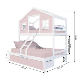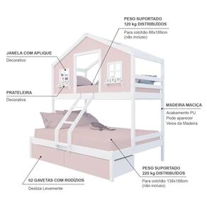 Material Principal: Madeira | Cor: Branco | Rosa | Necessita Montagem: Sim | Acompanha Colchão: Não | Tipo de Cama: Beliche Casal/Solteiro