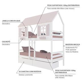 Material Principal: Madeira | Cor: Branco | Rosa | Necessita Montagem: Sim | Acompanha Colchão: Não | Tipo de Cama: Beliche Solteiro