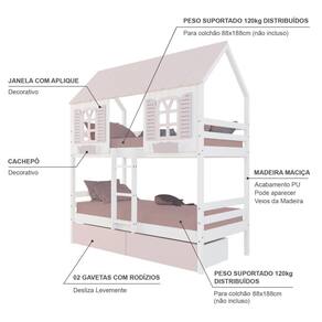 Material Principal: Madeira | Cor: Branco | Rosa | Necessita Montagem: Sim | Acompanha Colchão: Não | Tipo de Cama: Beliche Solteiro