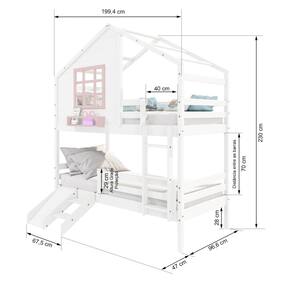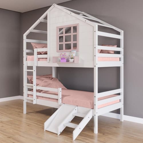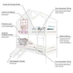 Diferenciais: Escada Fixa, Kit Escada/ Escorregador, Grade de Proteção Removivel, Casinha com fechamento em MDF, Janela e Prateleira para Livros e Decoração, Montagem Reversível (Lado Direito ou Lado Esquerdo)