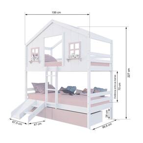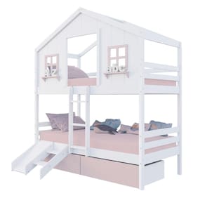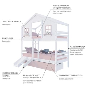 Diferenciais: Escada Fixa, Casinha com fechamento em MDF, Janela e Prateleira Decorativa, 02 Gavetas com Rodízios, Kit Escada e Escorregador.