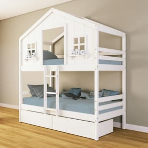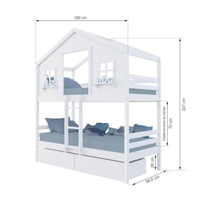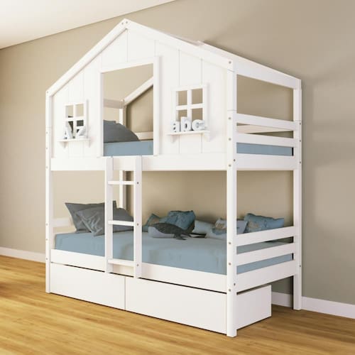 Diferenciais: Escada Fixa, Casinha com fechamento em MDF, Janela e Prateleira Decorativa, 02 Gavetas com Rodízios.