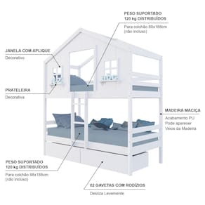Diferenciais: Escada Fixa, Casinha com fechamento em MDF, Janela e Prateleira Decorativa, 02 Gavetas com Rodízios.