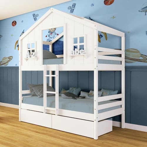 Diferenciais: Escada Fixa, Casinha com fechamento em MDF, Janela e Prateleira Decorativa, 02 Gavetas com Rodízios.