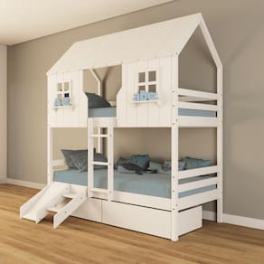 Diferenciais: Escada Fixa, Casinha e Telhado com fechamento em MDF, Janela e Prateleira Decorativa, 02 Gavetas com Rodízios, Kit Escada/ Escorregador.