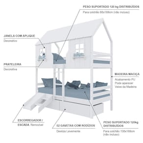 Material Principal: Madeira Maciça | Cor: Branco | Necessita Montagem: Sim | Acompanha Colchão: Não | Tipo de Cama: Beliche Solteiro