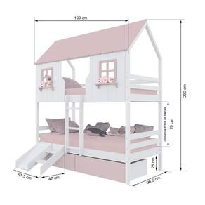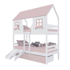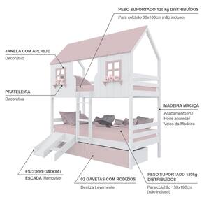 Diferenciais: Escada Fixa, Casinha e Telhado com fechamento em MDF, Janela e Prateleira Decorativa, 02 Gavetas com Rodízios, Kit Escada/ Escorregador.