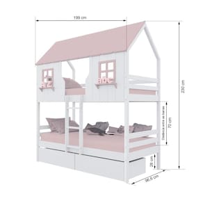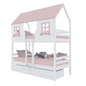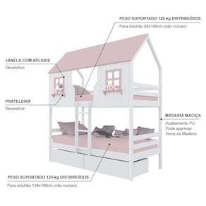 Diferenciais: Escada Fixa, Casinha e Telhado com fechamento em MDF, Janela e Prateleira Decorativa, 02 Gavetas com Rodízios.