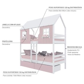 Diferenciais: Escada Fixa, Casinha e Telhado com fechamento em MDF, Janela e Prateleira Decorativa, 02 Gavetas com Rodízios.