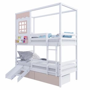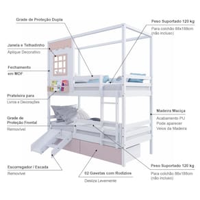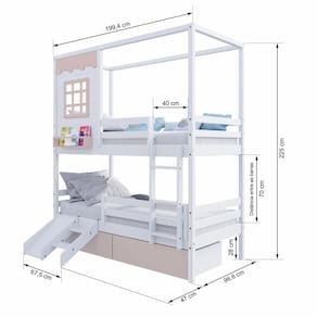 Diferenciais: Escada Fixa, 02 Gavetas, Kit Escada/ Escorregador, Grade de Proteção Removível, Casinha com fechamento em MDF, Janela e Prateleira para Livros e Decoração, Montagem Reversível (Lado Direito ou Lado Esquerdo)
