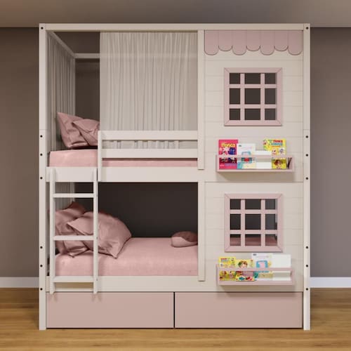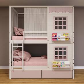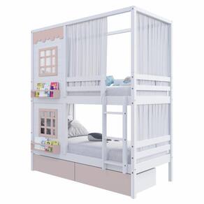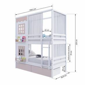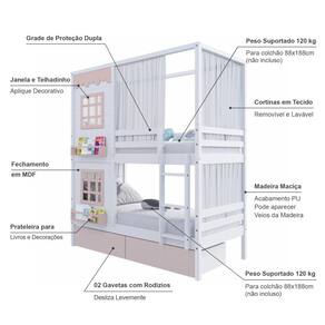 Diferenciais: Escada Fixa, 02 Gavetas, Kit Cortina Superior e Inferior, Casinha com fechamento em MDF, 02 Janelas e Prateleira para Livros e Decoração, Montagem Reversível (Lado Direito ou Lado Esquerdo)