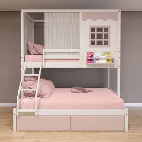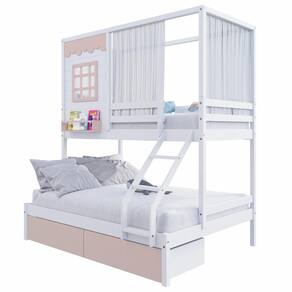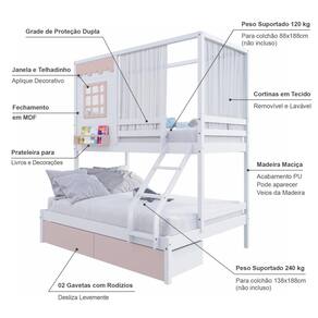 Diferenciais: Escada com Leve Curvatura, Cortina, 02 Gavetas, Casinha com fechamento em MDF, Janela e Prateleira para Livros e Decoração,Montagem Reversível (Lado Direito ou Lado Esquerdo)
