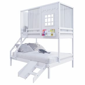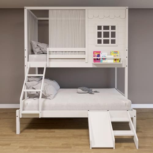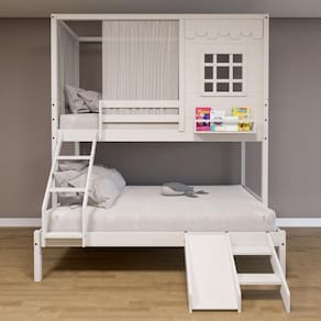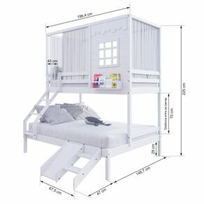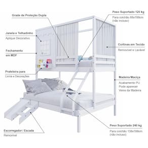 Diferenciais: Escada com Leve Curvatura, Cortina, Kit Escada/ Escorregador, Casinha com fechamento em MDF, Janela e Prateleira para Livros e Decoração,Montagem Reversível (Lado Direito ou Lado Esquerdo)