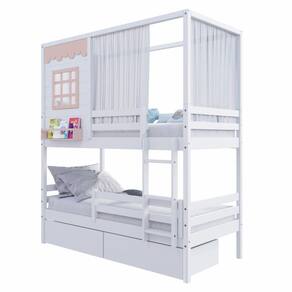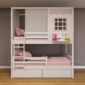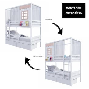 Diferenciais: Escada Fixa, 02 Gavetas, Grade de Proteção Removível, Cortina Superior, Casinha com fechamento em MDF, Janela e Prateleira para Livros e Decoração, Montagem Reversível (Lado Direito ou Lado Esquerdo)