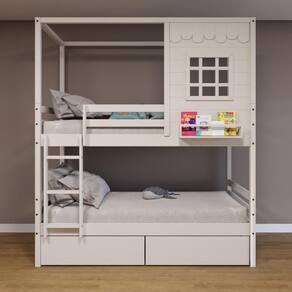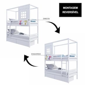 Diferenciais: Escada Fixa, Casinha com fechamento em MDF, Janela e Prateleira para Livros e Decoração, 02 Gavetas, Montagem Reversível (Lado Direito ou Lado Esquerdo)