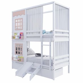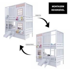 Diferenciais: Escada Fixa, 02 Gavetas, Kit Escada/ Escorregador, Kit Cortina Superior e Inferior, Casinha com fechamento em MDF, 02 Janelas e Prateleira para Livros e Decoração, Montagem Reversível (Lado Direito ou Lado Esquerdo)