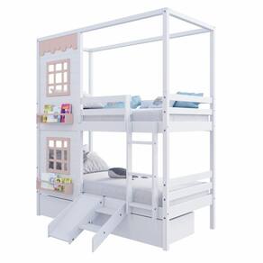 Diferenciais: Escada Fixa, Casinha com fechamento em MDF, 02 Janelas e Prateleira para Livros e Decoração, 02 Gavetas, Kit Escada/ Escorregador, Montagem Reversível (Lado Direito ou Lado Esquerdo)